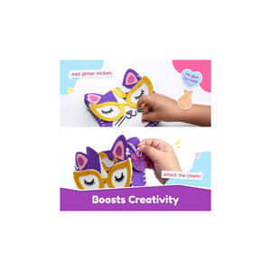 - Sew, Stick, and Style: Easy steps to sew the bag base, stick the kitty cutouts, and decorate with glitter stickers and a kitty paw charm.