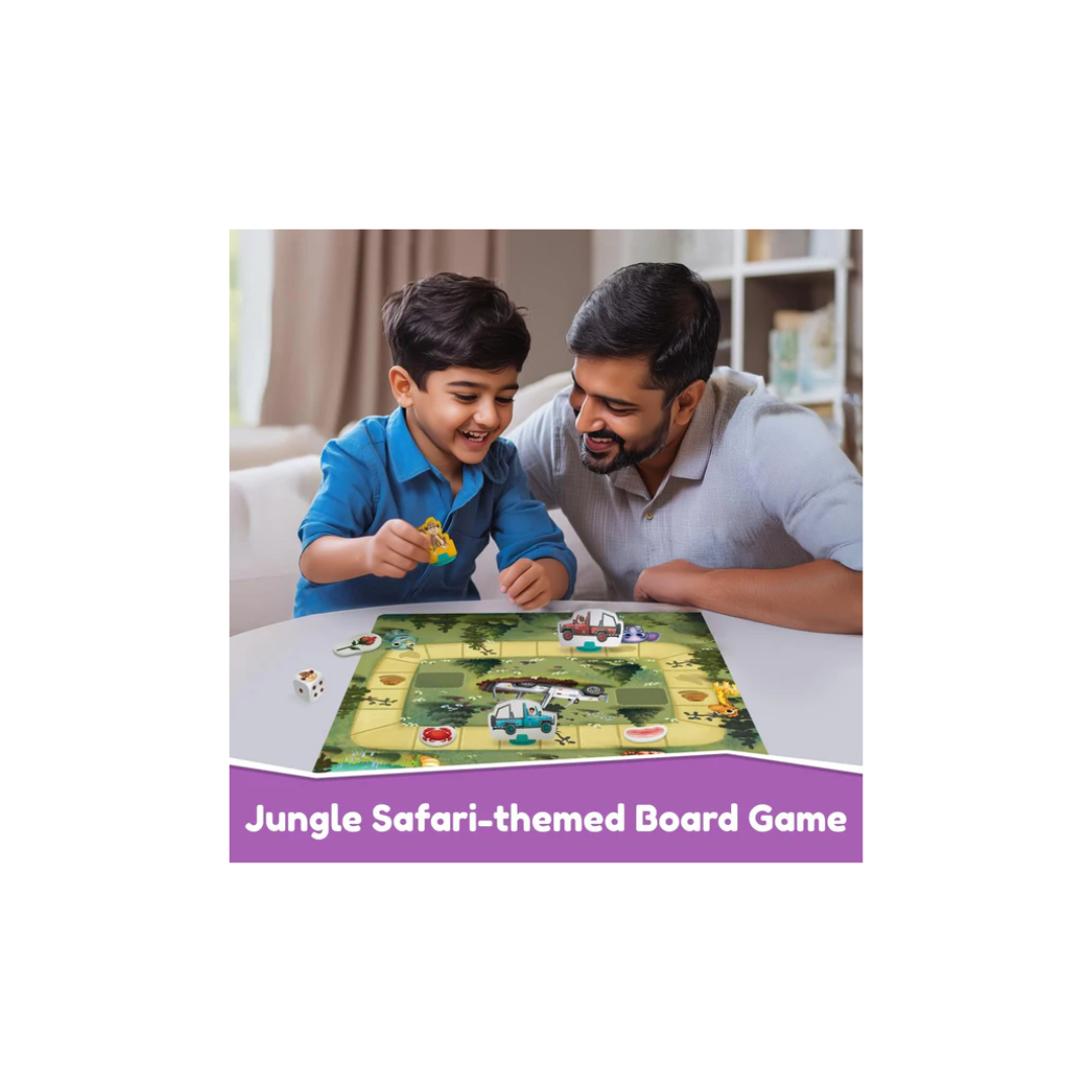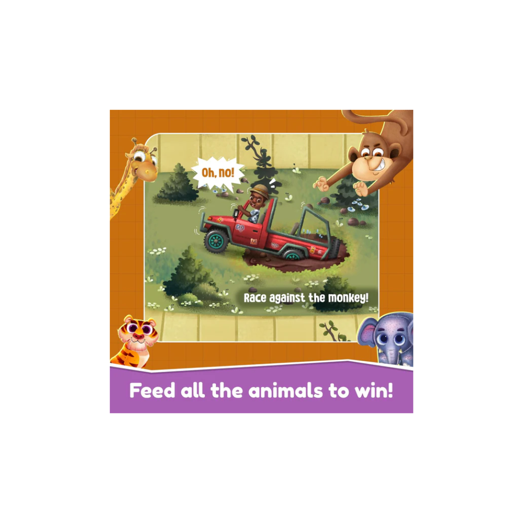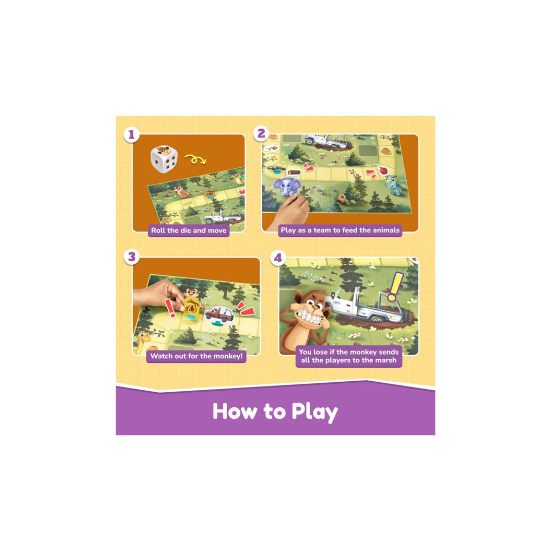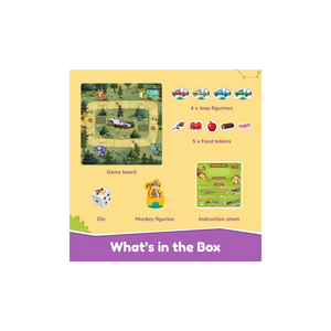 - What's in the Box: Includes a vibrant game board, monkey figurine, 4 jeep figurines, 5 food tokens, 1 game board, 1 die, and an easy-to-follow instruction sheet.