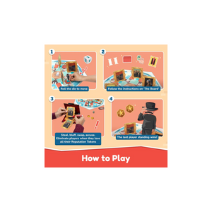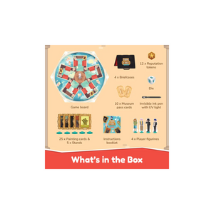 - IN THE BOX -1 Game board, 4 Player figurines, 4 Briefcases, 8 Reputation tokens, 5 Original painting cards, 20 Fake painting cards, 5 Stands, 10 Museum pass cards, 1 Invisible ink pen with UV light, 1 Die, 1 Instruction booklet