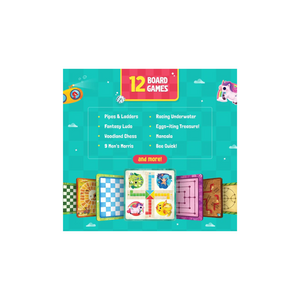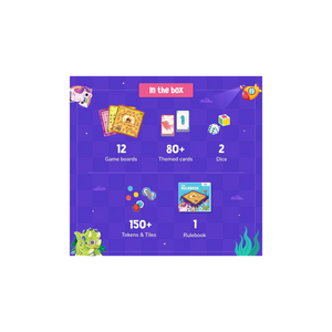 - IN THE BOX - 12 Board games, 8 Card games, 80+ Themed cards, 150+ Tokens and Tiles, 2 Dice, 1 Rulebook.