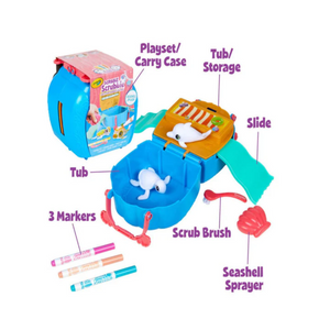 - OCEAN PLAYSET: Includes 2 Cute Ocean Animals, 1 Tub, 1 Scrub Brush, 3 Washable Markers and 1 Beach Environment that doubles as a storage solution.