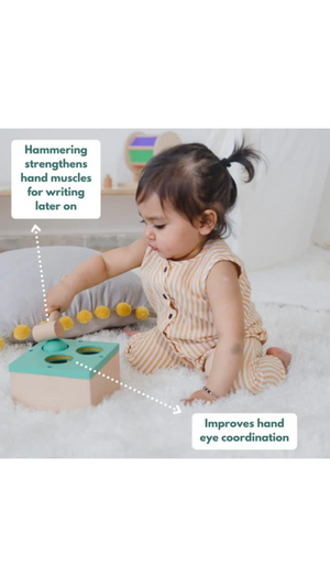 Hammering is a great activity for toddlers. It develops hand-eye coordination and strengthens their hands which is especially important for writing later on. All these benefits while they enjoy banging and hitting balls. A definite win-win for both kids and parents.