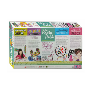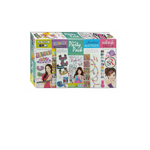 "5 in 1 Party Pack The ultimate rubber band bracelet maker! Design Colorful patterned bracelets and bangles! Fashion Bodyart Modest Beautiful acrylic beads to create fabolous range of jewellery. Welcome to the joys of nail art with 20 reusable artificial nails Helps the kid to design beautiful bracelets with rubber bands. With full instructions and equipments to complete the bracelet Make designer bracelet with tape stickers Make Body art with Colorful Tatooos, stickers and stencils Comes with a set of beads to make fashion jewellery alongside detailed instructions to help them make beautiful designs Nail Art Kit has got artificial nails, nail polish and stickers (Safe to use since you are wearing artificial nails) Key Features Made of durable material with fine work of detailing and great visual appeal Allow your child to explore new thing by DIY - Do it yourself kits with their friends and parents Easy and safe to use Create memorable times beyond the vicinity of your home Helping your little ones grow independent indulge in these powerful games and enjoy sheer thrill and action packed activity games Enhances creativity among kids Keeps the kid occupied and let them have the fancy thoughts of getting ready to a party For ages 5 Years and above Suitable for Girls A complete gift set for girls Contents : Over 600 colourful rubber bands Weaving loom weaving hook S-clips Acrylic bangle 3 rolls of fashionable patterned tapes Mini tape dispenser glitter tattoo pen 1 Ready to use tattoo sheet  Tattoo stencil Acrylic beads Fish hooks Ear hooks Necklace clasp Bracelet clasp  Beading wire Set of 20 artificial nails Nail paint Colourful nail stickers Nail glue  Toe separator  Easy to use detailed instructions. Warning - CHOKING HAZARD - Small Parts, Not Suitable for children under 3 years".