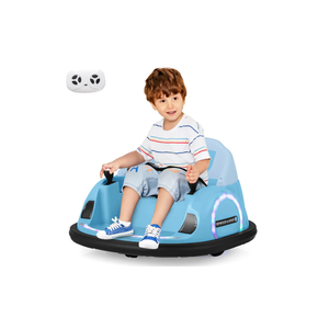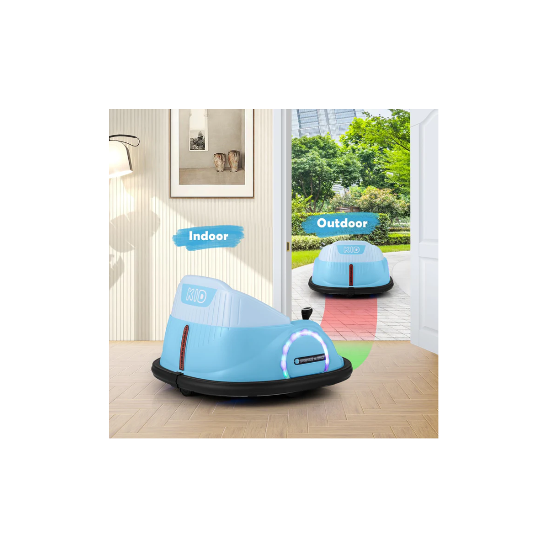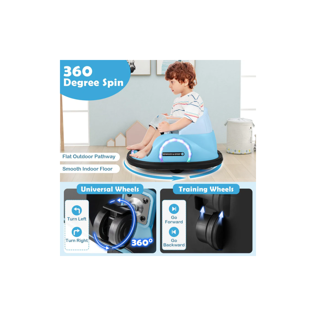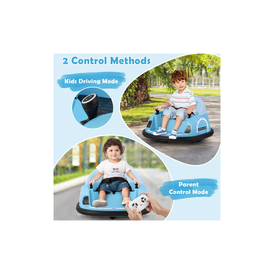 Playing fun never ends with our ride on bumper car for kids! Perfect for endless fun, this electric bumper car offers 360° spin and smooth forward/backward movement thanks to its 2 universal wheels and 2 training wheels. Safety is paramount with a shock-absorbent bumper and a maximum speed of 1.25 mph. The slow start feature adds an extra layer of security compared to normal start functions. Suitable for children over 18 months old, this ride-on bumper car boasts 2 control modes for independent or parent-controlled driving. The flashing LED lights, integrated music, and connectivity options bring endless entertainment possibilities. Powered by a 12V battery, this bumper car boasts extended playtime. The spacious seat and thoughtful footrests provide additional comfort, making each ride a joyous and pleasant experience.