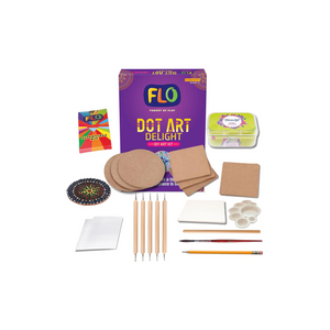 - FULL DIY ART KIT WITH EVERYTHING INCLUDED – The Flo Dot Art Delight kit contains 4 round and 4 square MDF coasters, 1 textured canvas board, 1 set dotting tools, 1 detail brushes, 6 acrylic colors, 1 drawing pencil, 1 mixing palette, and 2 sheets of protective stickers. It’s the complete painting kit for adults and kids, ideal for dot painting, Mandala art, and craft lovers looking to create with ease