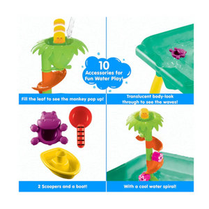 Product Includes - 1. Water Table-1no 2.Spirals-2nos 3. Leaf-1 no 4.Funnel-1no 5. Boat-1no 6.Scoop-1no 7.Legs-4nos 8. Plug-1no 9.Hip scoop-1no 10.Floating Monkey-1no 11.Spinning wheels (Assembled) 12. Instruction Sheet