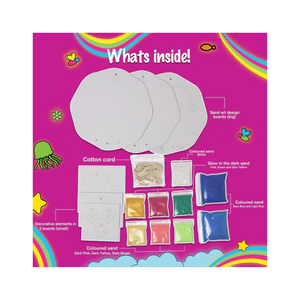 With Twilight Treasures you can make 3 unique Sand Art that glows in the dark which can be hung! Make 3 glow in the dark sandboards in the Underwater, Land and Sky themes! Glow in the dark sand is included with 9 Vibrant sand colours inside!
