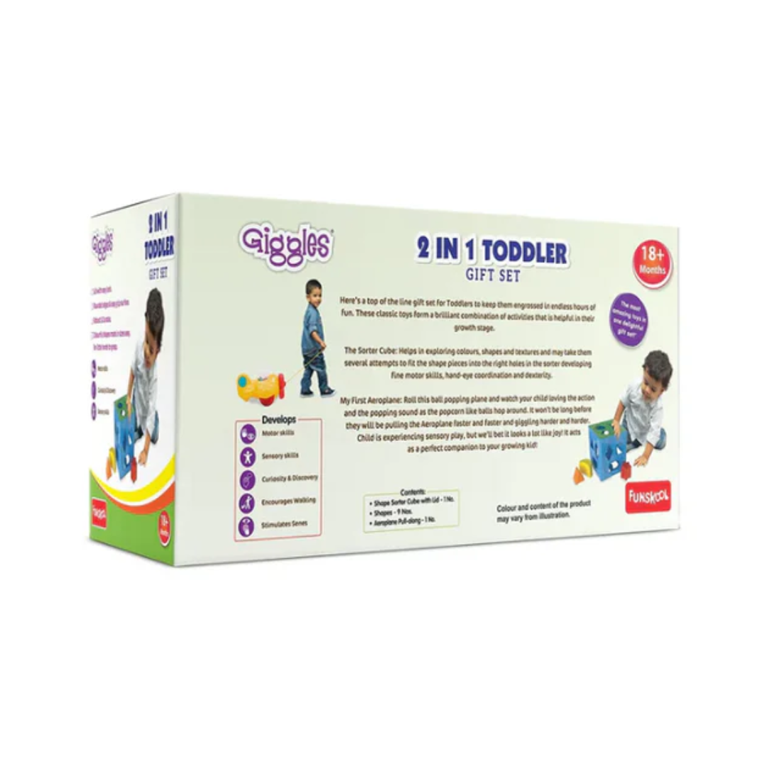 COLOURFUL GIFT TOY SET : This 2 in 1 Toddler Gift set is manufactured for kids in the age group of 18 months plus . The set includes the Shape Sorting cube and a My First Aeroplane Pull Along