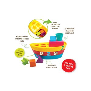 Has your champ recently started taking interest in colours and shapes? Then this Funskool stack a boat is a very good option which will keep him entertained as well as develop his cognitive skills. Funskool, one of the leading toy manufacturers, has come up with this set of stack a boat contains 3 boat bases of different sizes and colours. The top base has 3 different shapes to sort and it has 3 different shapes to assemble too. They are made of child safe durable plastic and have no sharp edges. It is ideal for kids over 12 months of age. Benefits of stack a boat. Develops hand eye coordination when the child tries to stack one on top of the other then it automatically helps in developing the hand eye coordination. Helps in identifying colours. The bright colours of the cubes help your child to identify the basic colours like red, blue, green and yellow. Since the shapes are different, the kid has to identify the correct shape to fit into the boat, which help to improve their observation power. Keeps the kid occupied. In the process of stacking the boat and push n pull option, your child will remain occupied for a certain period of time. So get your little one this interesting game and helps him develop his overall motor skills.|4 in 1 fun stack sort, push pull boat| 3 different shapes to assemble|3 different shapes to post|