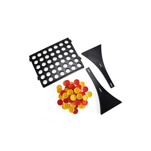 Includes grid, 2 legs, slider bar, 21 red discs, 21 yellow discs and instructions