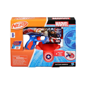 - NERF MARVEL CAPTAIN AMERICA BLASTER: Head into heroic adventures with this eye-catching blaster that features Captain America designs on both sides