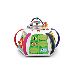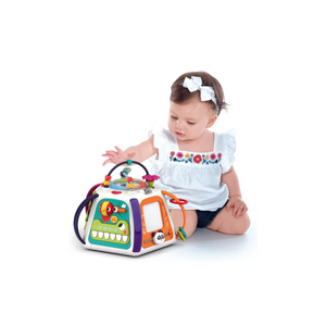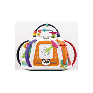 18 different games: Bead maze with two tracks; Fun mirror; LED ring; Rotating ball; Woodpecker; Butterfly; Crocodile teeth; Music button; Rotating flower; Wave pattern; Jumping dots; Ladybird; 6 matching games; Rotating sun; Rotating cogs with animal designs; Magic sketch board; Panda eraser; Flower pen;