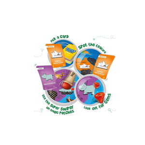 1 game board, 110 quest cards, instruction sheet, 1 sand timer, 1 super swiper, 10 gems