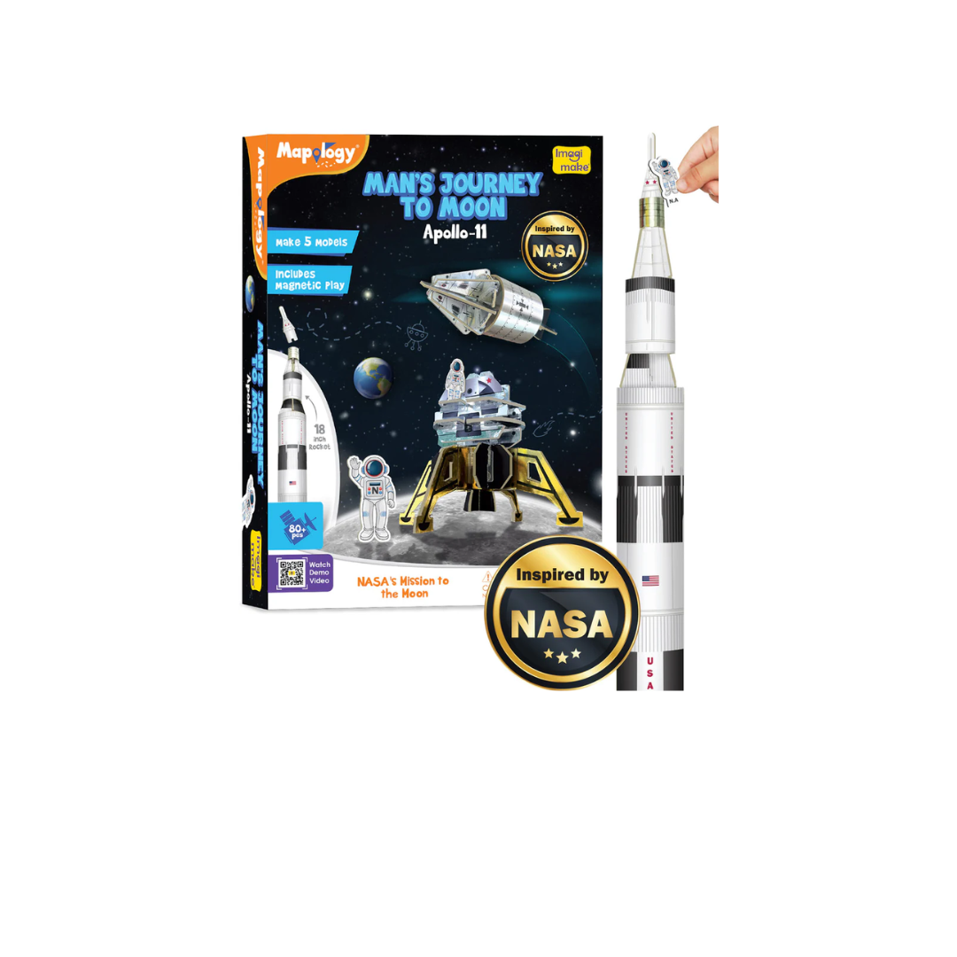 - NASA's MISSION TO THE MOON: Imagimake inspired by NASA are excited to teach children about Man's Journey to the Moon. This Model-making kit features 5 models: an 18-inch Saturn V Rocket and 4 satellites