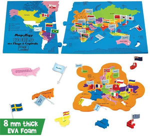 A Unique and fun foam puzzle specially design to explore and learn about Countries, their Flags and Capitals across the World. This entire jigsaw puzzles for kids is a great learning aid to Europe and World Map that comes with 2 foam puzzle frames � 1 for World map and 1 for Europe map, to help children get a magnified view of popular European Country. The Puzzle accompanies 75 country pieces cut in as per political map shapes and snugly fit with each other to create an impact of replica of the World Map, which ensure hours of fun and constructive play time for kids. This toys for kids pack also contain sticker for flags and capital of 65 countries from around the world. Stick the flag sticker on one side and capital sticker of the same country on other side of the flag and place the flag on the belonging countries. Guiding instruction is provided in the box to help kids place right flag on the right country. Both the maps use a thicker 8 mm foam base that makes the product longer lasting and easier to handle. The vibrant coloured pieces are very exciting for a child to play with. One of the best toys for 5 year & above that helps on building motor skills and spatial skills and caters to childs learning and knowledge development. This educational toys for kids 5 years is also very popular as a return gift for birthday for kids in the range of 5 - 8 years. Size of the puzzle is 58 cm x 33 cm - Safe & Sturdy Material - complies with European safety standards.