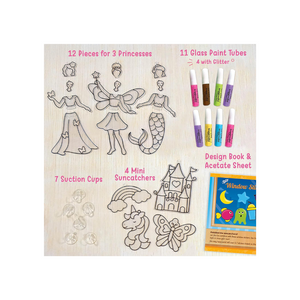- PRINCESSES & UNICORNS: Paint the different parts of the Princess, Mermaid & Fairy in glittering glass paints and then add a Unicorn to complete the scene and transfrom the window in to a beautiful dreamland!
