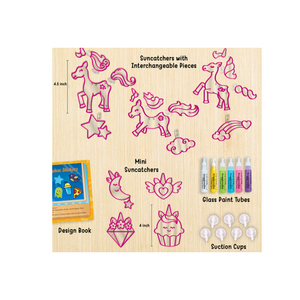 - BOX INCLUDES: 12 pieces for 3 unicorns, 4 Mini Suncatchers, 6 Peelable Stickers, 11 Glass Paint Tubes, 1 Glass Liner (5ml Each), 7 Suction Cups, 1 Design Book & Acetate Sheet