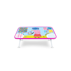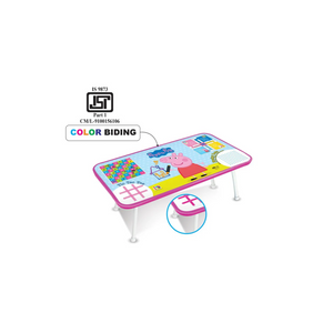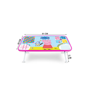 Peppa Pig Multipurpose Portable Ludo Game Table For Kids This Peppa pig table is perfect for all age groups. The job and profession demand you to stand up for hours at a time, and using this table will help ease pain in the neck and shoulders. You can use it without fear since the surface has been manually trimmed and polished to make them smooth, round, and clean edges which helps prevent accidents and injury. The beautiful and eye-catching design of Peppa pig along with ludo makes it a fantastic table. It is primarily used for beds, children's bedside tables, writing, sofas, laptops, or tablets. It has a scientific design. It can be used in a family setting, sofa, dormitory, small table, or workstation. The curved edge of the desktop, the cup holder, the ergonomic design, and the protective covering all contribute to a more pleasant experience for the user. The dust- and water-resistant table comes with a laminated top which can be used for various purposes. It includes one set of dice and sixteen pawns made of plastic. It is also a fantastic play for the entertainment of a group. It is perfect for play, holding laptop and other purposes too.