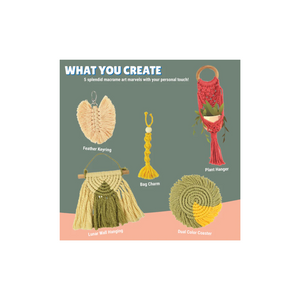 - FULL PACKAGE: Our Macrame Kit for Beginners includes everything you need to create five delightful Macrame projects. Craft a Macrame Coaster, Mini Wall Hanging, Feather Keychain, Charm, and Plant Hanger with ease using the provided materials.