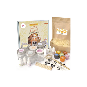 - ALL MATERIAL INSIDE THE BOX: This kit includes all materials required to make 6 personalized Aroma Beeswax Jar Candles. It contains Pure & Natural Beeswax (500 gm), Glass Jars (x6), Candle Wicks (x6), 5 ml Fragrance Oils (lavender, strawberry, coca, lemongrass, green apple, candy), Powder colors (x6), Wick Sustainers (x6), Stirrers (x6),Jute thread, Jar stickers and tags, instructions manual.