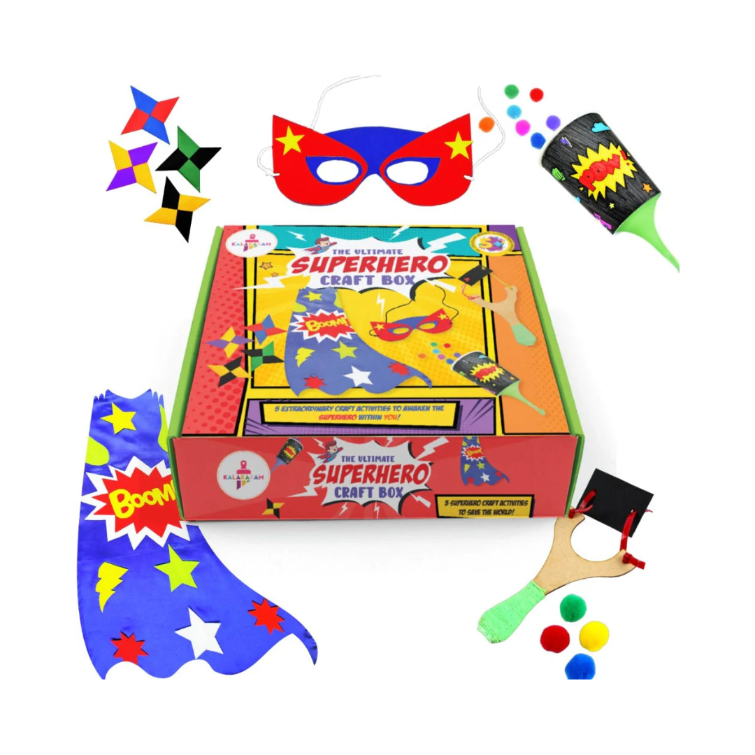 - 4 SUPERHERO CRAFT ACTIVITIES : This box contains 5 craft activities – A Superhero Satin Cape, a Superhero Face Mask, Origami Ninja Stars, Wooden Slingshot & Pom Pom Shooter !