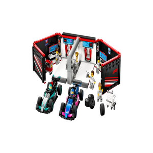 - What’s in the box? – Includes a toy car garage with workbenches, tool and welding carts, a tower of slick tyres and 2 F1® race cars, plus a winner’s trophy and 2 driver and 4 mechanic minifigures