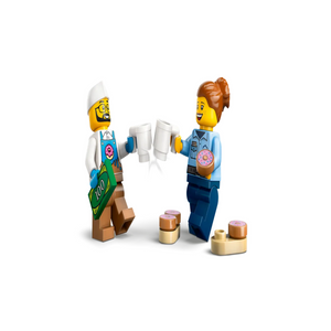 - LEGO® minifigure accessories – This kids’ playset comes with lots of accessories for pretend play, including a toy coffee machine, cash register, donut sign, 4 donuts and 2 mugs