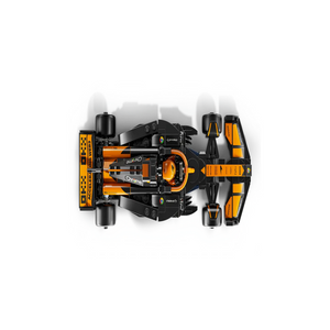 The F1 model car features a cockpit that opens by lifting the halo bar, a rear wing, wishbone suspension, sponsor stickers and wider rear tires imprinted with “Pirelli.” The toy vehicle also comes with a driver minifigure wearing a McLaren outfit and a winged helmet to place inside the cockpit for racing action.