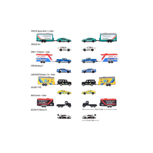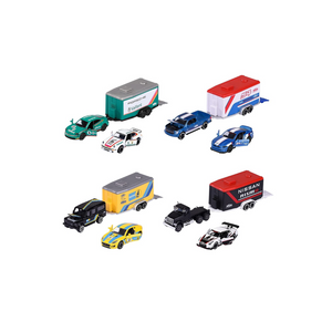 - 3-part set: 2 toy cars & 1 trailer with authentic motor sport design