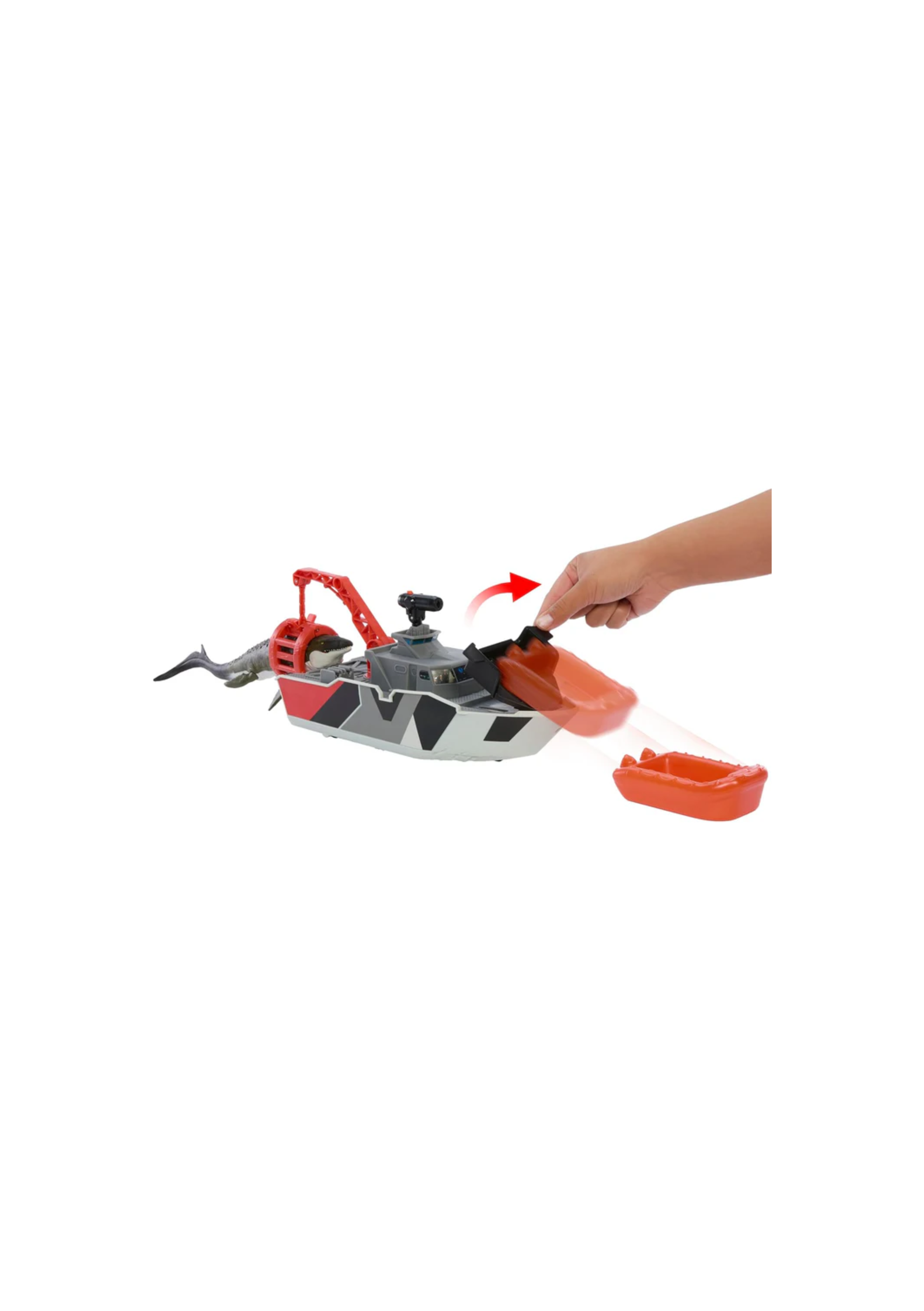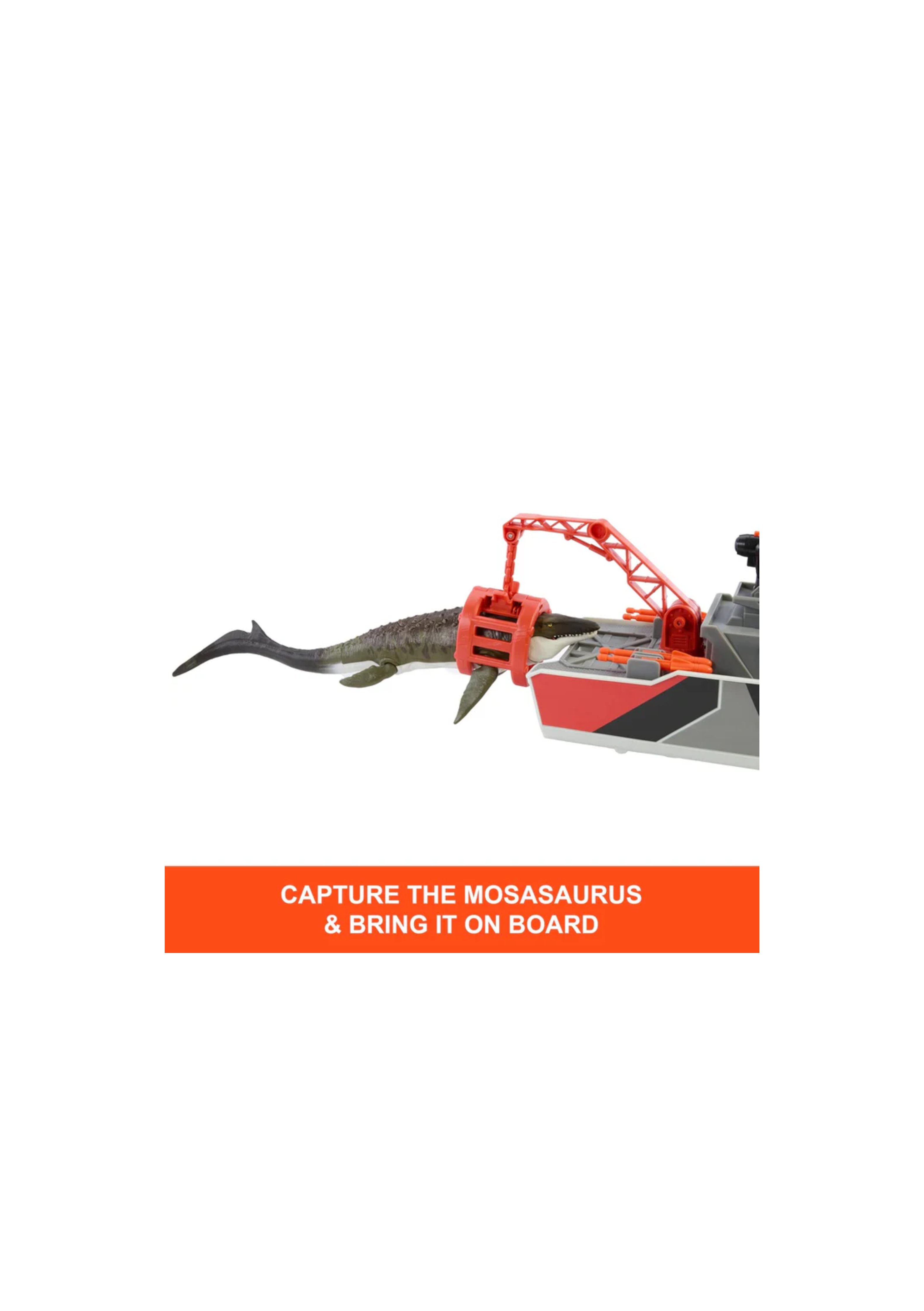 - The 12.5" boat features realistic details like a working winch that can be hooked onto the 13" Mosasaurus included. Watch out for jaws and fins moving as it is dragged aboard!