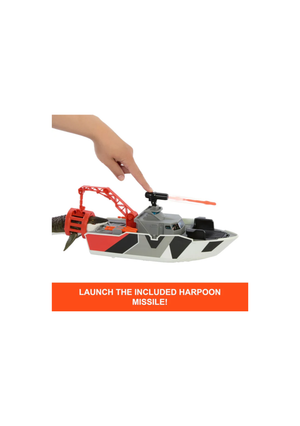 - The boat includes a missile launcher and is equipped with 2 harpoon missiles to extract dinosaur DNA for laboratory analysis.