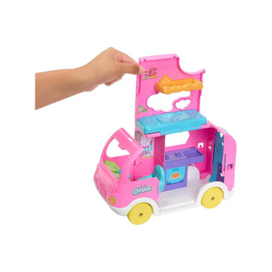 - 2-in-1 playset: rolls like a camper and opens into a full campsite scene