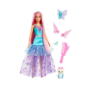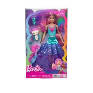 This Barbie doll can only be described as magical with her long fantasy hair and shimmering dress! Barbie "Malibu" Roberts doll wears a sparkly outfit inspired by her look in Barbie A Touch of Magic™. Two pets and styling accessories add to the fantastical fun! Doll cannot stand alone. Colors and decorations may vary.
