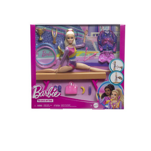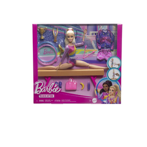 Kids will love this Barbie Gymnast Playset! Includes a swivel doll and over 10 accessories for favorite activities! Inspire your own choreography on the ground or on the balance beam and perform spectacular moves in the air with the help of the special clip! Simply secure the clip to the doll's waist and Barbie is ready for cartwheels, jumps and more! Accessories include additional hoops, hoops, a cup and leotard, making the matches even more exciting! Offering endless hours of play, this set makes an ideal gift for children aged 3 and up. The doll cannot stand up or spin on its own. The colours