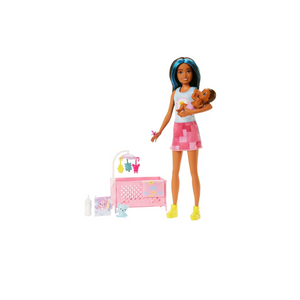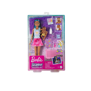 This bedtime-themed Barbie Skipper Babysitters Inc. playset inspired by the movie lets kids explore their nurturing side with Skipper doll, a baby doll -- with dreamy sleep feature -- a crib and storytelling pieces. Help give baby a bottle or pacifier and watch their eyes grow sleepy! Kids can collect all the Babysitters Inc. dolls and toys for endless Barbie® babysitting adventures (each sold separately, subject to availability). Dolls cannot stand alone. Colors and decorations may vary.