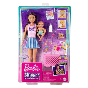 This bedtime-themed Barbie Skipper Babysitters Inc. playset inspired by the movie lets kids explore their nurturing side with Skipper doll, a baby doll -- with dreamy sleep feature - a crib and storytelling pieces. Help give baby a bottle or pacifier and watch their eyes grow sleepy! Kids can collect all the Babysitters Inc. dolls and toys for endless Barbie babysitting adventures (each sold separately, subject to availability). Dolls cannot stand alone. Colors and decorations may vary.