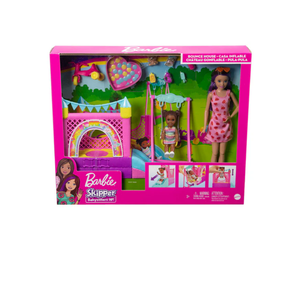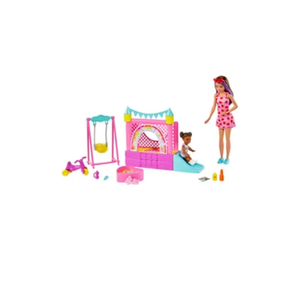 This Barbie® Skipper™ Babysitters Inc.™ playset lets kids explore their nurturing side as the babysitter as they discover the ultimate day of play! Help Skipper™ doll care for toddler doll as she explores her very own personal playground featuring a rainbow-inspired bounce house, slide, swing, heart-shaped ball pit and tricycle. There's so much fun to be had! Skipper™ doll and toddler doll are ready for backyard fun in cute, casual outfits, and storytelling accessories inspire even more nurturing play. Kids ages 3 years old and up can collect other Babysitters Inc.™ dolls and accessories to fill a babysitting schedule full of fun! Each sold separately, subject to availability. Dolls cannot stand alone. Colors and decorations may vary.