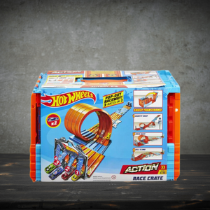 Hot Wheels® Race Crate is the ultimate racing and stunt building set in one! Combines multiple ways to play with 3 exciting and unique races. Kids can race, loop and challenge friends when they transform this super-cool crate into 3 different challenges that include the Gravity Drop, Mega Jump and Drag Race! Ignite their imagination with the pop-out raceway, 8+ feet of track and different challenges they can experience using the fair start gate, 2-lane loop, finish gate and 2 double slam launchers. Each crate includes a Builders Guide. Some younger racers may require help from parents to transform the challenges. All the accessories included can be used in other sets with setup instructions and labels for storage, set-up and breakdown. Fold the crate up and place all the parts inside for easy portability and storage. Includes 2 Hot Wheels® cars. Ages 6-10 years old.