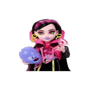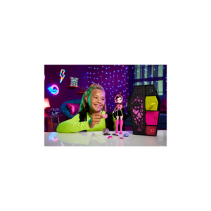 - Draculaura doll makes a statement with bold pink highlights and makeup. Stow her and all her Neon Frights inside the coffin-shaped locker for easy storage and on-the-go portability.