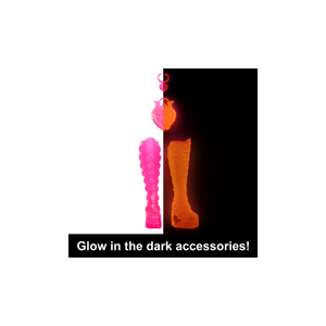 - Turn off the lights to discover three accessories that glow in the dark! Mix-and-match them with the other included styling pieces to create outfits that will light up even the darkest of nights.
