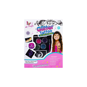Our glitter tattoo kit is a "do it yourself" product that is so easy to do and no artistic skills are required. The results are simply professional-looking temporary tattoos that are waterproof (lasts up to five days), safe for the skin and most importantly - glitter and beautiful!|Everything needed to create your own fun glitter tattoos.| Includes 10 reusable tattoo stencils, 4 pots of cosmetic glitter with 2 make up brushes for easy application.|On trend gifts for girls delivered straight to your door.|Easy to apply and remove. Tested, safe and non toxic ingredients.