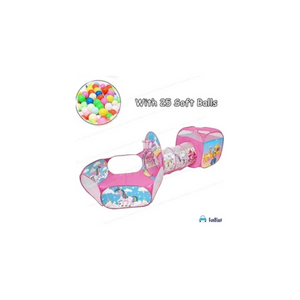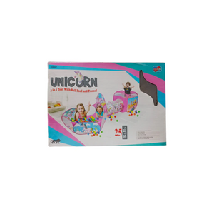 - 3 In 1 Unicorn Tunnel with Ball Pool It consists of 3 foldable pop-up tents i.e tunnel tent, ball pool tent and hut shaped hexagonal tent. Can be played separately or all three together