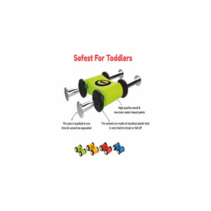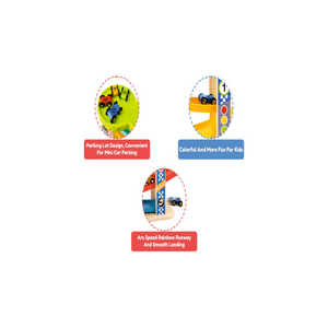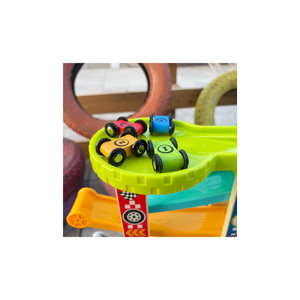 This Open Ended Rolling Ramp Racer includes a 6-ramp race track, a parking lot at the top of the structure, and 4 wooden mini toy cars, each with a different color and number. The colorful ramps, installed at angles, allow cars to descend smoothly and excitingly; two ramps have an adjustable slope that the child can control to increase or decrease the speed of the vehicles. The car wheels are made of sturdy plastic and are securely attached to the bodies of the cars by permanently joined axles. The vibrant colors increase the fun and stimulate children visually to engage them better in their game. This toy helps kids improve their hand-eye coordination, motor skills, and problem-solving abilities. It also boosts their imagination, creativity, focus, and social skills. The playset is mainly pre-assembled; only the parking lot is to be installed. Made of quality wood and sturdy plastic with smooth edges and painted with non-toxic water-based paint for increased safety. Suitable for kids 18 months and older.