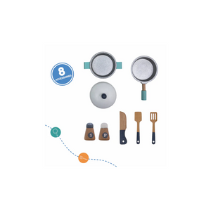 - 8 Accessories: This set includes pot, pan, lid, spoon, spatula, Knife and a pair of salt and pepper shakers
