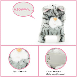 - Advanced Features: This cute walking toy has a variety of smart features that your kids are going to love. The robot cat walks, utters a meow sound, and wags his tail. The electro soft toy cat is a wonderful way to help build your child's important key skills and keep him stay active.