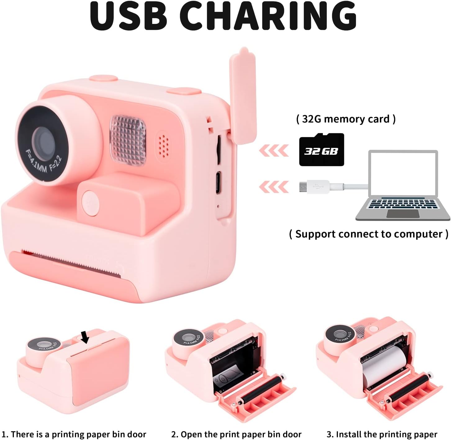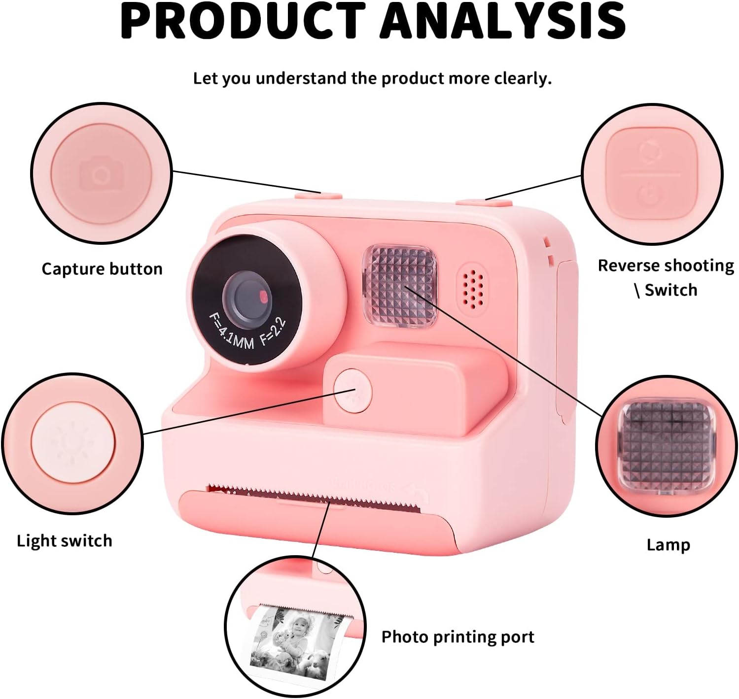 ABOUT THIS ITEM:The cute and powerful camera makes children eager to explore the outside world, children record their childhood, leaving a wealth of memories. Cultivate your childs interest in photography and take the first step towards becoming a talented photographer.Feature:Instant Printing: Kids camera using thermal printing technology, photos can be printed without ink cartridges and toner at the press of a key, with printer paper for you to use.Photo Video: Instant camera with front and rear dual lens, built in smart fill light, support selfie and video, allow you can take up to 48MP photos, catch the wonderful moment anytime.Long Endurance: Kids instant camera built in 1400mAh battery, with continuous photo taking and recording time of 34 hours. By USB cable, connect to computer to download pictures and videos.Easy to Use: Instant print camera adopted ergonomic design, fit comfortably in children hands, one key to take photo and one key to print, with a lanyard for hanging, which is easy to operate.Ideal Gift: 48MP Instant camera is a perfect Birthday, New Year, Christmas, Thanksgiving, Holiday gifts for girls and boys, which made of ABS, PC, silicone materials, safe and skin friendly.Specification:Item Type: Instant Printing CameraMaterial: ABS, PC, SiliconeBattery Type: Lithium Battery 1400mAh (Included)Use Time: About 4.0 hoursCharging Time: About 2.0 hoursRecording Time: About 2.5 hoursMemory Card Maximum Support: 32GPackage List:1 x Camera3 x Photo Paper6 x Colors1 x Manual1 x Lanyard1 x Sticker1 xUSB CableABOUT THIS ITEM: The cute and powerful camera makes children eager to explore the outside world, children record their childhood, leaving a wealth of memories. Cultivate your childs interest in photography and take the first step towards becoming a talented photographer. Feature: Instant Printing: Kids camera using thABOUT THIS ITEM: The cute and powerful camera makes children eager to explore the outside world, children record their childhood, leaving a wealth of memories. Cultivate your childs interest in photography and take the first step towards becoming a talented photographer. Feature: Instant Printing: Kids camera using th