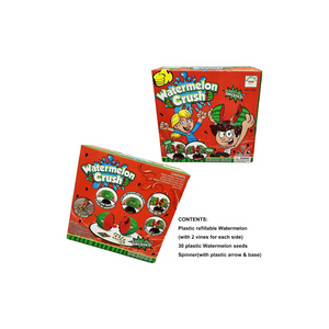 - Watermelon crush game includes plastic refillable watermelon (with 2 vines for each side), 30 watermelon seeds and 1 spinner