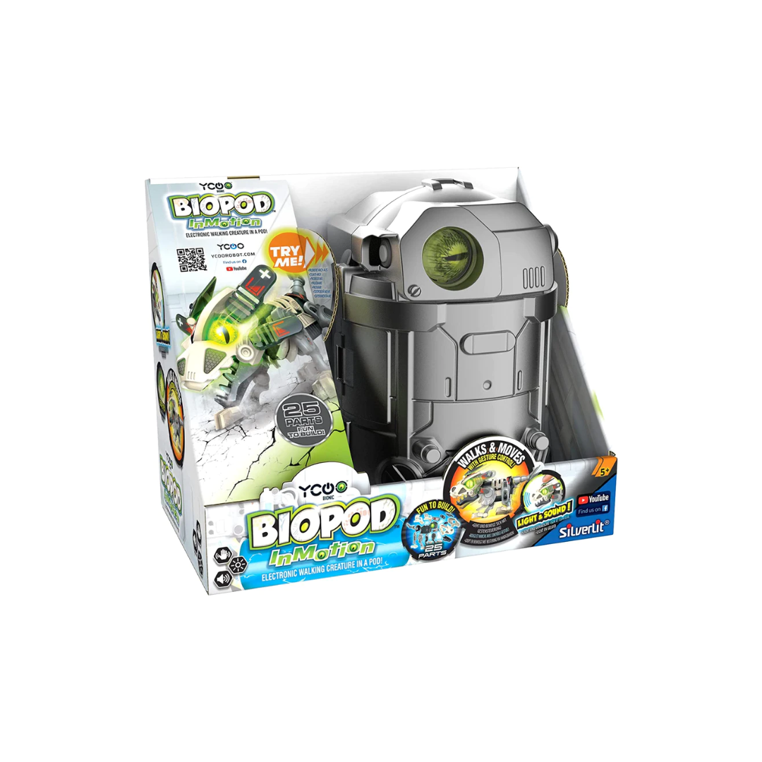 - Dotato di occhi LED e sensore di movimento, Biopod InMotion misura complessivamente 22 cm ed è composto da 25 pezzi da assemblare, nascosti all’interno di una capsula con try-me.