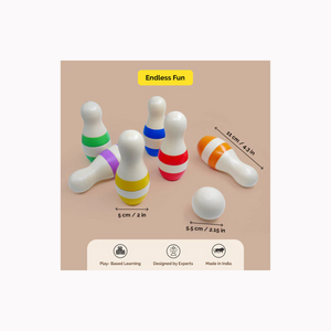 The Wooden Mini Bowling Pins Set is designed for children aged 2 years and up. It includes six sturdy, brightly painted wooden pins and a wooden ball, perfect for developing hand-eye coordination, gross motor skills, and spatial awareness. This set, ideal for both indoor and outdoor play, encourages physical activity and social interaction while providing endless fun.Building early development skills through play