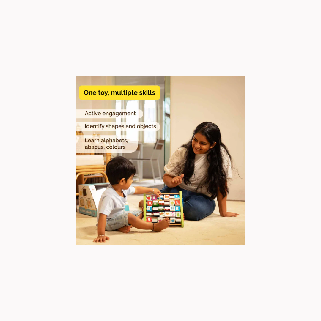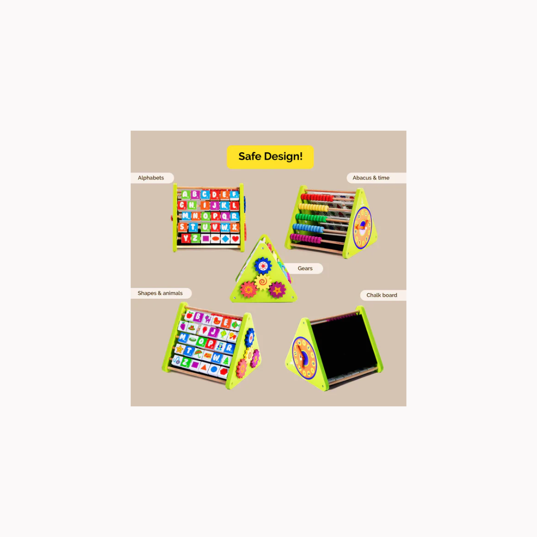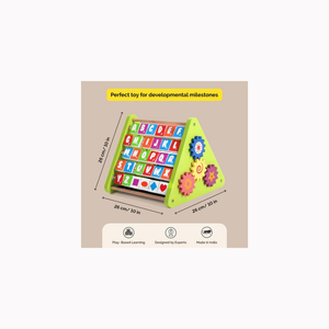 One Shumee Wooden Activity TriangleFive-sided multi-activity toy for your toddler.Stimulate mental ability and teach counting skills on the colourful Abacus. Colourful ABC swivel blocks stimulate alphabet and picture recognition and learning. Brightly coloured wooden gear wheels engage the toddler, spark imagination and build mental ability. Learn to tell time by moving the keys on the large, brightly coloured clock. Move shapes around in multi-coloured slider grooves while developing fine and gross motor skills and hand-eye coordination.